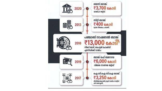 3. പഞ്ചാബ് നാഷണൽ ബാങ്ക്: നിരവ് മോദി, മെഹുൽ ചോക്സി എന്നിവരുമായി ബന്ധപ്പെട്ട വിദേശ സ്ഥാപനങ്ങൾക്ക് 2018ൽ മതിയായ ഈടില്ലാതെ നൽകിയ 13,000 കോടി രൂപ കിട്ടാക്കടമായതോടെയാണ് റിസർവ് ബാങ്ക് പഞ്ചാബ് നാഷണൽ ബാങ്കിനെതിരെ നടപടിയെടുത്തത്. രാജ്യത്തെ ഏറ്റവും വലിയ ബാങ്കിംഗ് തട്ടിപ്പുകളിലൊന്നാണിത്. ബാങ്ക് ഉദ്യോഗസ്ഥരുമായി കൂട്ടുചേർന്ന് നടത്തിയ തട്ടിപ്പ് ഏറെ വർഷങ്ങൾക്ക് ശേഷമാണ് പുറത്തുവന്നത്.