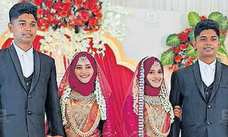 ചിറ്റൂർ ∙ മിനിറ്റുകളുടെ വ്യത്യാസത്തിൽ പിറന്ന്, ഒരേദിവസം ജോലിയിൽ പ്രവേശിച്ച ഇരട്ട സഹോദരങ്ങൾക്ക് ഒരേദിവസം വിവാഹവും. തത്തമംഗലം മേട്ടുവളവ് ചാടി ഹൗസിൽ എസ്.സബിയുള്ളയുടെയും എ.എസ്.നസീറ ബീഗത്തിന്റെയും മക്കളായ എസ്.ആഷിക് അഹമ്മദ് (28), എസ്.ആരിഫ് അഹമ്മദ് എന്നിവരാണ് വടക്കഞ്ചേരി അഞ്ചുമൂർത്തി മംഗലം വടക്കേത്തറ ഹൗസിൽ എ.അലിയാർ–എച്ച്.സലീന ദമ്പതികളുടെ മക്കളായ അൻസില നസ്രിൻ (22), അൻസിയ നസ്രിൻ (22) എന്നിവരെ വിവാഹം ചെയ്തത്. വധൂവരൻമാരായി ഇരട്ടസഹോദരങ്ങളെത്തന്നെ ലഭിച്ചത് ഇരു കുടുംബങ്ങൾക്കും ഇരട്ടി മധുരമായി. കഴിഞ്ഞ ദിവസം ആഷിക് അൻസിലയെ മഹറണിയിച്ച നേരത്തുതന്നെ ആരിഫ് അൻസിയയെയും മഹറണിയിച്ചു. തൃശൂർ ജില്ലാ ഹെഡ് ക്വാർട്ടേഴ്സിലെ പൊലീസ് ഉദ്യോഗസ്ഥരാണ് ആഷിക്കും ആരിഫും. 2020 ഫെബ്രുവരി 15നാണ് ഇരുവരും സിവിൽ പൊലീസ് ഓഫിസർമാരായി ജോലിയിൽ പ്രവേശിച്ചത്. അൻസിലയും അൻസിയയും ഡിഇഎൽ–എഡ് കഴിഞ്ഞവരാണ്.