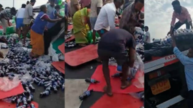 വിശാഖപട്ടണം: നിയന്ത്രണംവിട്ട് ലോറിയിൽനിന്ന് ശീതളപാനീയ കുപ്പികൾ കൈക്കലാക്കി നാട്ടുകാർ. മദ്യമാണെന്ന് കരുതി ശീതളപാനീയ കുപ്പികൾ ശേഖരിക്കുന്ന നാട്ടുകാരുടെ വീഡിയോ സോഷ്യൽ മീഡിയയിൽ പ്രചരിക്കുന്നുണ്ട്. സംഭവം നടന്ന സ്ഥലമോ സമയമോ ഔദ്യോഗികമായി സ്ഥിരീകരിച്ചിട്ടില്ല. അതേസമയം, ആന്ധ്രാപ്രദേശിലെ നെല്ലൂർ ജില്ലയിലാണ് സംഭവം നടന്നതെന്നാണ് റിപ്പോർട്ട്.
