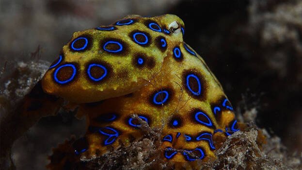 ശരീരത്തിൽ നീല നിറത്തിലെ വളയങ്ങളോട് കൂടിയ ഈ നീരാളി കാഴ്ചയിൽ മനോഹരമാണ്. പക്ഷേ ആളെ കൊല്ലാൻ ശേഷിയുള്ള ഭീകരനാണിത്.