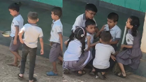 ഉച്ചഭക്ഷണം കഴിഞ്ഞുള്ള വൃത്തിയാക്കൽ പരിപാടിക്കിടെയാണ് ഒരു മിടുക്കി കൂട്ടുകാരനെ ആശ്വസിപ്പിക്കാനെത്തിയത്. അവളെ വിളിക്കാനെയി കോരിയുമായി എത്തിയ മറ്റൊരു കൂട്ടുകാരിയെ അവൾ ഓടിച്ച് വിടുന്നുണ്ട്. ഏത് സ്കൂളിലെ കുട്ടികളാണ് ദൃശ്യങ്ങളിലുള്ളതെന്ന് വ്യക്തമല്ല. ‘അക്ഷരങ്ങളെക്കാൾ മുൻപ് അവർ പഠിച്ചത് സ്നേഹിക്കാനാണ്’ എന്ന കാപ്ഷനോടെയാണ് കുട്ടികളറിയാതെ പകർത്തിയ വീഡിയോ സോഷ്യൽ മീഡിയയിൽ പങ്കുവച്ചിരിക്കുന്നത്.