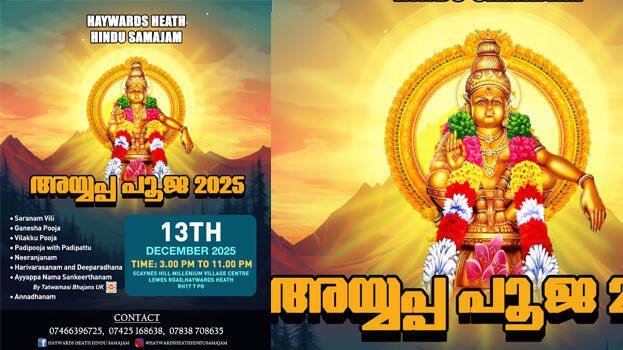 ലണ്ടൻ: ഇംഗ്ലണ്ടിലെ ഹേവാർഡ്സ് ഹീത്ത് ഹിന്ദു സമാജത്തിന്റെ പതിനെട്ടാം വർഷ അയ്യപ്പ പൂജ 2025 ഡിസംബർ 13 ശനിയാഴ്ച നടത്തും. വെെകിട്ട് മൂന്ന് മണിമുതൽ 11 മണിവരെ ഹേവാർഡ്സ് ഹീത്തിലുള്ള സ്കെയ്ൻസ് ഹിൽ മില്ലെനിയും വില്ലേജ് സെന്റെറിൽ വച്ച് വിപുലമായ രീതിയിലാണ് നടത്താൻ ഉദ്ദേശിക്കുന്നത്.