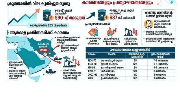 ക്രൂഡോയിൽ വില ബാരലിന് 89 ഡോളർ കടന്നുകൊച്ചി: ആഗോള സാമ്പത്തിക മേഖലകളെ മുൾമുനയിലാക്കി ഇന്ധന വില പുതിയ ഉയരങ്ങളിലേക്ക് നീങ്ങുന്നു. ഇന്നലെ ബ്രെന്റ് ക്രൂഡിന്റെ വില ബാരലിന് 90 ഡോളറിന് അടുത്തെത്തി. ലോകമെമ്പാടും കനത്ത വിലക്കയറ്റത്തിന് ഇന്ധന വിപണിയിലെ അനിശ്ചിതത്വം കാരണമാകും. ഡബ്‌ള്യു.ടി.ഐ ക്രൂഡ് വില ബാരലിന് ആറ് ഡോളർ ഉയർന്ന് 87 ഡോളറായി. അമേരിക്കയുടെയും ഇസ്രയേലിന്റെയും സംയുക്‌ത ആക്രമണത്തിന് തിരിച്ചടിയായി ഇറാൻ ഹോർമുസ് ഇടനാഴി അടച്ചതാണ് ആഗോള ഇന്ധന വിപണിയെ പ്രതിസന്ധിയിലാക്കുന്നത്. ലോകത്തിലെ മൊത്തം ഇന്ധന ഗതാഗതത്തിന്റെ 20 ശതമാനം ഇതുവഴിയാണ് നടക്കുന്നത്. പ്രകൃതി വാതക വ്യാപാര ലഭ്യതയും കുത്തനെ കുറയുകയാണ്. പ്രകൃതി വാതകത്തിന്റെ വില വരും ദിവഭങ്ങളിൽ കുതിച്ചുയരുമെന്ന് വിദഗ്ദ്ധർ മുന്നറിയിപ്പ് നൽകുന്നു.ഹോർമുസ് ഇടനാഴി അടച്ചതോടെ ഗൾഫ് രാജ്യങ്ങൾ എണ്ണയുടെയും പ്രകൃതി വാതകത്തിന്റെയും ഉത്പാദനം കുത്തനെ കുറയ്ക്കാൻ നിർബന്ധിതരായി. ചരക്ക് നീക്കം തടസപ്പെട്ടതിനാൽ ഇന്ധനം സ്‌റ്റോക്ക് ചെയ്യാൻ സംവിധാനമില്ലാത്തതാണ് പ്രധാന വെല്ലുവിളി.