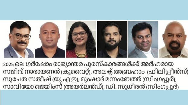 ബംഗളൂരു: ഗർഷോം ഫൗണ്ടേഷന്റെ 2025ലെ ഗർഷോം രാജ്യാന്തര പുരസ്കാരങ്ങൾ പ്രഖ്യാപിച്ചു. സജീവ് നാരായണൻ (കുവൈറ്റ്), അലക്സ് അബ്രഹാം (ഫിലിപ്പീൻസ്), സുചേത സതീഷ് (യു എ ഇ), മുംഷാദ് മന്നംബേത്ത് (സിംഗപ്പൂർ), സാവിയോ ജെയിംസ് (അയർലൻഡ്), ഡി. സുധീരൻ (സിംഗപ്പൂർ) എന്നിവരാണ് 20 -ാമത് ഗർഷോം പുരസ്കാരങ്ങൾക്ക് അർഹരായത്. മികച്ച മലയാളി സംഘടനയ്ക്കുള്ള അവാർഡിന് റഷ്യയിലെ ഓൾ മോസ്കോ മലയാളി അസോസിയേഷൻ (അമ്മ) തിരഞ്ഞെടുക്കപ്പെട്ടു.