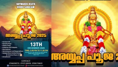 ലണ്ടൻ: ഇംഗ്ലണ്ടിലെ ഹേവാർഡ്സ് ഹീത്ത് ഹിന്ദു സമാജത്തിന്റെ പതിനെട്ടാം വർഷ അയ്യപ്പ പൂജ 2025 ഡിസംബർ 13 ശനിയാഴ്ച നടത്തും. വെെകിട്ട് മൂന്ന് മണിമുതൽ 11 മണിവരെ…
