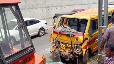 നിർത്തിയിട്ടിരുന്ന ക്രെയിനിന്റെ പിന്നിൽ സ്കൂൾ ബസ് ഇടിച്ചു; ഡ്രൈവർക്ക് ദാരുണാന്ത്യം